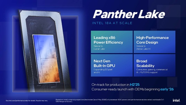 また、次世代の内蔵GPUを搭載し、グラフィックス、ゲーミング、AI性能のさらなる向上を期待できる。インテルの計画では、Panther Lakeは2025年下半期に生産が開始され、2026年初頭にコンシューマー向け製品が市場に投入される予定とアナウンスがあった。