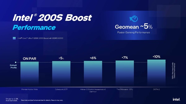 ゲーミング向けの機能として、特定のCore Ultra 200Sシリーズプロセッサー向けにIntel 200S Boostという新しいパフォーマンスプロファイルが導入された。これはBIOSで設定可能で、RAM、メモリーコントローラー、ダイ間、ファブリック周波数をオーバークロックでき、最大DDR5-8000のIntel XMPキットに対応する。