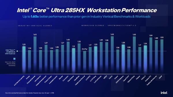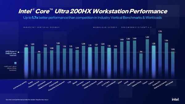 Core Ultra 200HXシリーズは、モバイル分野での最高性能を追求するモデル。Mobile WorkstationセグメントではSPECworkstation 4.0の特定のワークロードにおいて、AMD Ryzen 9 7945HXと比較して最大1.7倍優れた性能を発揮。また、前世代のCore i9-14900HXと比較しても、SPECworkstation 4.0で最大1.63倍優れている。