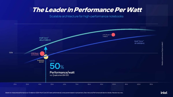 電力効率でも、55W PL1時で前世代(Core i9-14900HX)と比較し最大41%優れるとされ、クアルコムのSnapdragon X Elite X1E-84-100と比較して同様の電力レベルで最大50%の性能向上を示す。