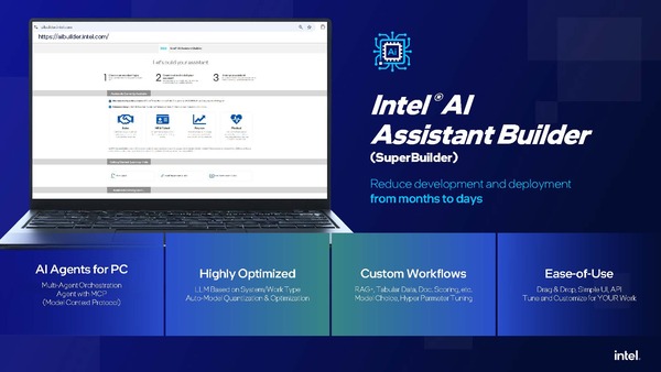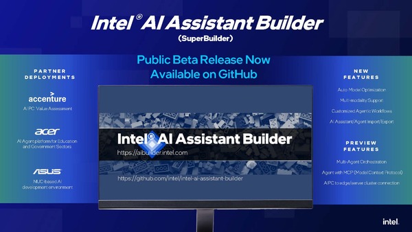 Intel AI Assistant Builderは、ローカルでAIチャットボットやエージェントを構築するためのツールとして紹介された。現在は公開ベータ版がインテルのサイト、またはGitHubで提供されている。Meteor Lake以降のAI PCに対応し、ドラッグ&ドロップ操作で特定の用途に最適化されたLLMモデルを作成し、実行ファイルとしてパッケージングできる。