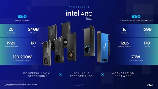 ワークステーション向けの「Arc Pro」も発表された。B50とB60の2モデルがあり、B50はデザイン・エンジニアリング向け(SFF対応)、B60はAIワークステーション向けとして位置づけられると説明。B50は16GBメモリーと170 TOPSのAI性能、B60は24GBメモリーと197 TOPSのAI性能を持つ。手頃な価格ながらパワフルなローカル推論能力を提供するという。