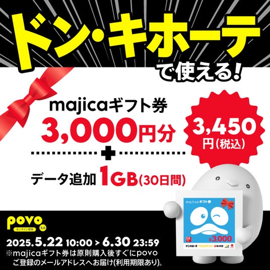 KDDI、沖縄セルラーは2025年5月22日から、povo2.0の期間限定トッピングとして、総合ディスカウントストア「ドン・キホーテ」で利用できる「majica ギフト券3,000円分」と、「1GB(30日間)」をセットにしたトッピングを3,450円で提供します。