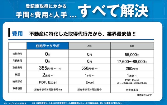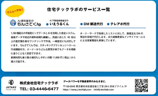 株式会社住宅テックラボ(本社:東京都渋谷区、代表取締役:梶宏輔、以下「当社」)は、不動産オーナーリスト作成サービス「オーナーサーチ」において、2025 年 5 月より新たに、**不動産会社ごとの営業戦略やニーズに特化した「カスタムオーナーリスト作成サービス」**の提供を開始しました。