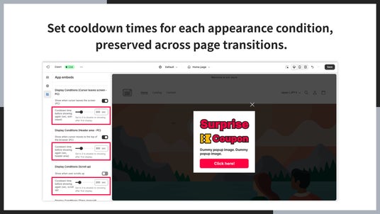 「UR: Smart Popup Banner App」を使うと、ポップアップバナーの出現条件を細かく設定できます。それぞれの出現条件に対して、再表示までのクールダウン時間を設定できます。