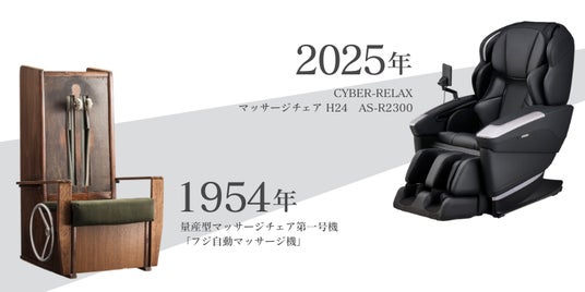 そこから71年間、マッサージチェアのパイオニアとして一人でも多くの方々の疲れを癒すマッサージチェアを世に送りだし、2025年3月には当社最新最高峰モデルの「CYBER-RELAX マッサージチェア H24 AS-R2300」を発売いたしました。