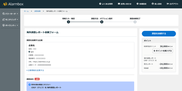 AI与信管理サービス「アラームボックス」を提供するアラームボックス株式会社は5月21日に、海外企業の企業調査を可能にする「海外調査レポート」の提供を開始した。クラウド上で海外企業の基本情報を入力するだけで、海外企業の信用調査が手軽に行えるようになるという。