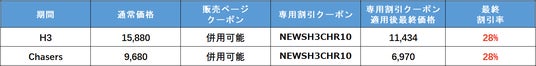 専用割引クーポン「NEWSH3CHR10」適用でH3が最終価格 11,434円、割引率28%
