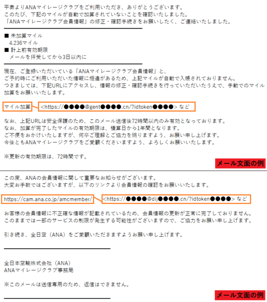 これはANAマイレージクラブからのメールを装い、「手続きの失敗でマイルが加算されていない。個人情報の修正・確認をせよ」「個人情報の内容が不正確なため、サービスを制限する可能性がある。下記リンクより内容を再確認せよ」といった内容を送り付けて偽Webサイトに誘導し、アカウント情報などを入力させてそのまま盗み取るというもの。