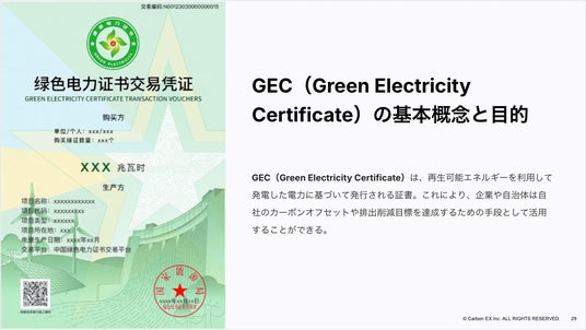 GECは、再生可能エネルギーの環境価値を証書化する仕組みであり、中国国内の国家再エネ電力情報管理プラットフォームを通じて発行・取引が行われています。2024年末時点での総発行数は約49.5億枚であり、世界でも最大級のグリーン電力証書市場に成長しています。
