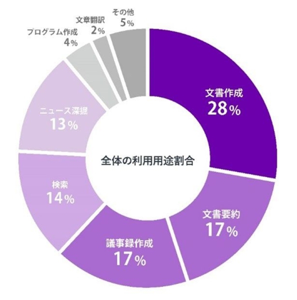 主な利用用途としては、「文書作成(各種資料草案、メール、キャッチコピーなど)」が28%と最も多く、「文章要約」(17%)、「議事録作成」(17%)、「検索」(14%)が続いている。プログラミング知識の浅い職員が、Excel VBAなどのコードを生成する事例もあるようだ。