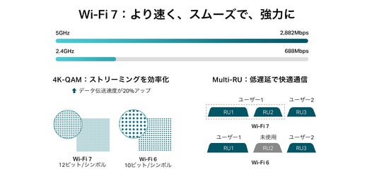 ・デュアルバンドWi-Fi 7で最大3.6Gbps(5GHz:2882Mbps + 2.4GHz:688Mbps)の通信速度を提供
