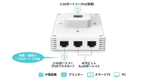 4つのポート(アップリンク×1+ダウンリンク×3)のうち、ダウンリンクポートの1つはPoEパススルーに対応しているため、VoIP電話のような有線デバイスを追加電源なしで給電・通信させることができます。