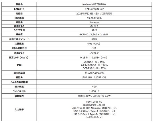 おしゃれなホワイトデザインを採用した高精細4K UHDモニター 27インチ・高画質IPSパネル・KVMスイッチ・USB PD98W 「Modern MD272UPHW」発売