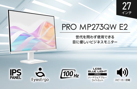 「PRO MP273QW E2」は、付属ケーブルも白で統一したおしゃれなホワイトデザインに、画面が大きくて見やすい27インチ、フルHDの約1.8倍の情報量を誇るWQHD(2,560 × 1,440)解像度、高画質なIPSパネルを搭載し、ビジネスやテレワークなどにお勧めなモデルです。MSIが提唱する世代を問わずに安心して使用できる「EyesErgoモニター」として、「ゲーミングモニター並みのリフレッシュレート100Hzでページのスクロール時にも滑らかな表示」「映り込みや反射を抑えるノングレアパネル」「チラつきを抑制するアンチフリッカー」「ブルーライトカット」の4つの目の疲労を軽減する機能を搭載しています。内蔵スピーカー(3W + 3W)やキーボード・マウスからモニターの設定を行うことができる「Display Kit」対応に加え、VESA規格のモニターアーム、対応したミニPCの取り付けも可能です。
