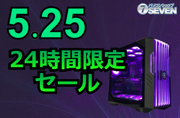 セブンアールジャパンは、5月25日に「2025/5/25 24時間限定セール」を開催する。このセールでは、同社が運営するパソコンショップSEVENにて、最新のゲーミングPCやデスクトップPCが最大79,000円引きで購入できる。期間は5月25日0:00から23:59までのわずか24時間だ。