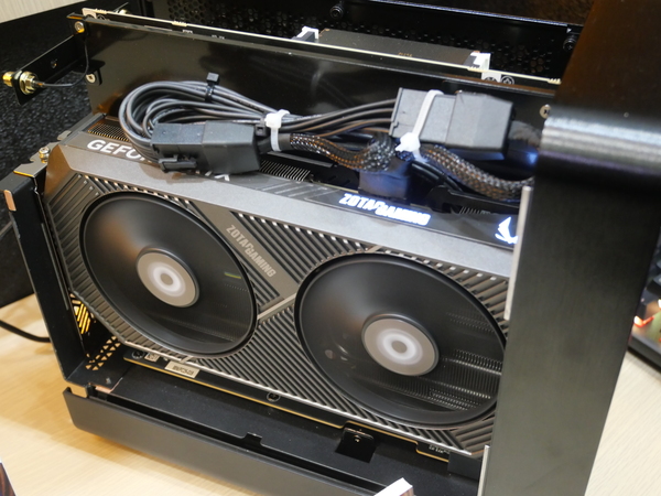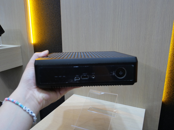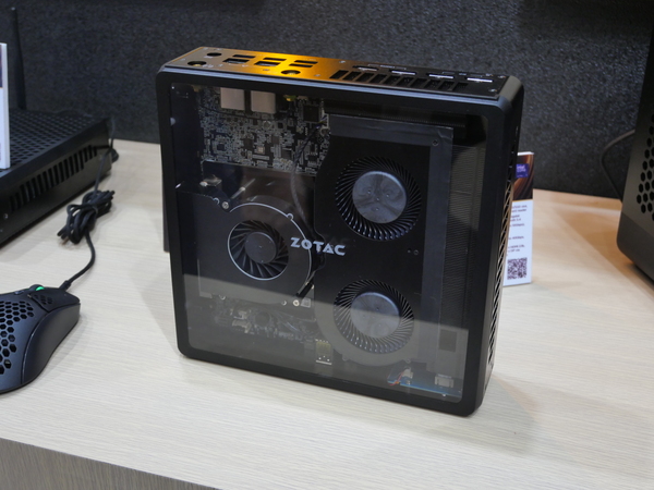 ビデオカードを搭載するコンパクトパソコンも2機種展示されていた。1つは、ZOTAC調べで、GeForce RTX 5060 Ti 16GBを搭載するパソコンの中で世界最小という「MAGNUS EN75060TC Mini To THE MAX」だ。CPUはCore Ultra 7 255Hが採用されている。また、このサイズ感ながら、駆動オンは結構抑えられているとのことだ。