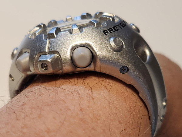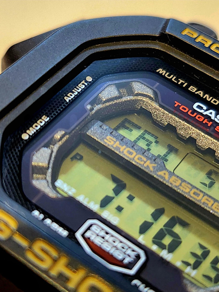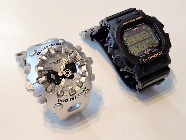 筆者自身、今回のイガイガG-SHOCKに手を伸ばす前、似たような衝動に駆られた経験があった。それが、G-SHOCK史上最大サイズの1つと称される「GXW-56-1BJF」だ。これは太陽光発電を搭載したソーラーモデルで電波腕時計。液晶部分を守るため、周囲に超堅牢バンパーを配した構造だ。腕に装着したときの「重厚感と存在感」で圧倒してくる一本だった。もちろん今も愛用している。