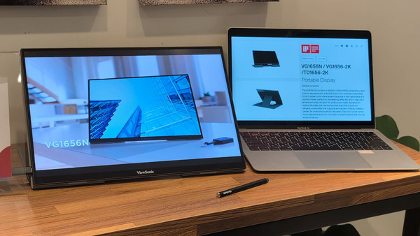 「VG1656N」と「TD1656-2K」は両モデルとも2025年のiFデザイン賞を受賞したポータブルディスプレー。VG1656Nは4000mAhのバッテリー内蔵しており、電源接続なしで約3時間の視聴が可能。USB Type-CドングルまたはUSB Type-Cケーブルでワイヤレス接続も可能だ。