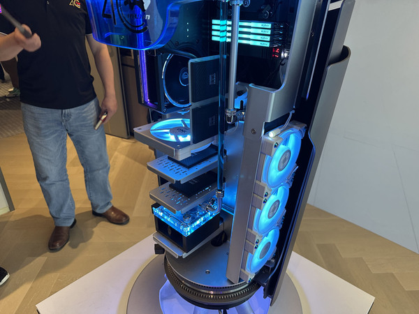 ChronoMancyは、In Winの長年にわたる進化を象徴するコンセプトで、時間の経過からインスピレーションを受けているという。それそれの節目は成長の段階を示し、蓄積された専門知識を未来のイノベーションへと発展させていく、とのことだが、あまりの大きさと可変ギミックに目を奪われてしまい、説明員の話が全然頭に入ってこない。とりあえず、数多くの受賞歴を持つIn Winだけに、トロフィーをモチーフにしているということだけは理解できた。