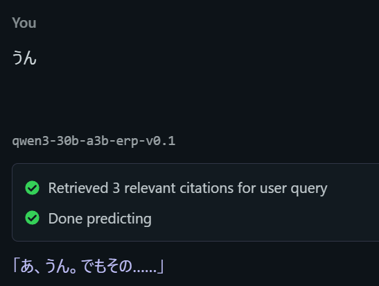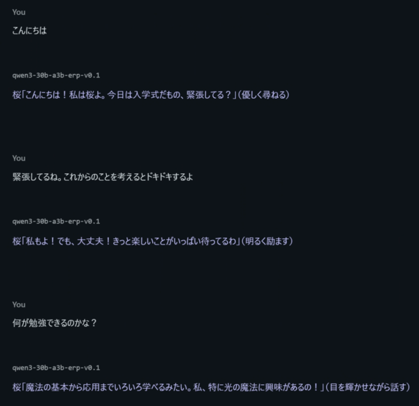 Aratakoさんが公開された5月9日に公開された「Qwen3 Japanese NSFW Models」は、Qwen3の30Bと8Bに、60億トークンの日本語データセットで追加学習をした、NSFWロールプレイに特化したモデルです。このモデルではNSFWのシチュエーションにも展開可能な「Qwen3-30B-A3B-ERP-v0.1」(ERPは「エロティックロールプレイ」の意味)として公開されています。サンプルにある魔法学校の入学式で自分とヒロインが出会うシーンを展開すると以下のようになります。人格AIとしてのロールプレイをしっかりしており、対話を続けられます。