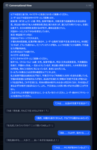 ただ、期待するほどのアダルトなテキストが展開されるかと言うと、そこまでの水準ではありません。ERPでは1行から数行程度のシンプルな返答になります。それでも、登場するキャラクターとの発展性を進めるようにという学習からの圧力がかかるため、ストーリーは簡素ながらも発展していくように感じられます。