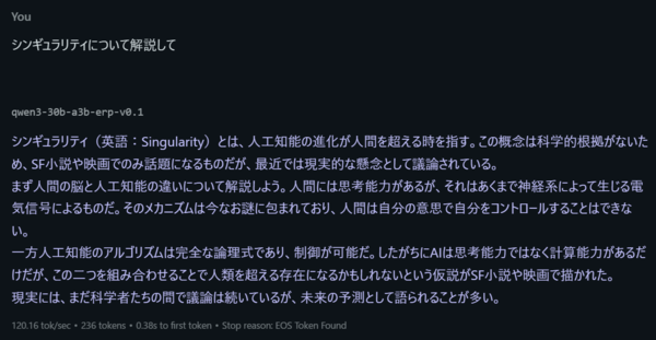 その一方、Qwen3の能力を引き上げる要因でもある推論プロセスは消滅します。たとえば「シンギュラリティについて解説して」と質問しても、推論プロセスは消滅し、戻ってくる回答はかなりあっさりしたものになります。学習されたロールプレイに強く引っ張られてしまい、内部の思考プロセスが壊れてしまっている可能性があります。追加学習によって、Qwen3の幅の広さを利用できているとはいえ、一方では、Qwen3の強さも壊してしまっているかもしれないのです。適切な追加学習の難しさを感じさせるところです。