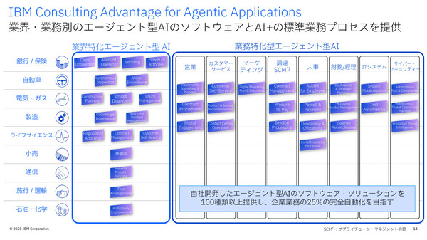 そこでIBMでは、100種類以上に及ぶ業界/業務特化型のエージェント型AI(ソフトウェア)と標準業務プロセスを自社開発し、これを用いたコンサルティングサービスを、IBM Consulting Advantage for Agentic Applicationsとして提供する。これにより、適用可能な業務領域を一気に拡大し、導入までの時間も大幅に短縮する狙いだ。