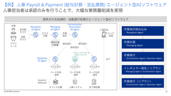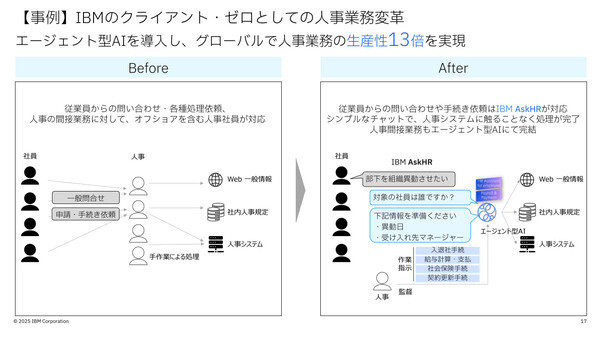 鳥井氏は、一例として人事領域(給与計算/支払業務)におけるエージェント型AIの例を紹介した。実際にIBM自身も人事領域においてエージェント型AIを導入しており、その結果、業務生産性を13倍高めることができたという。