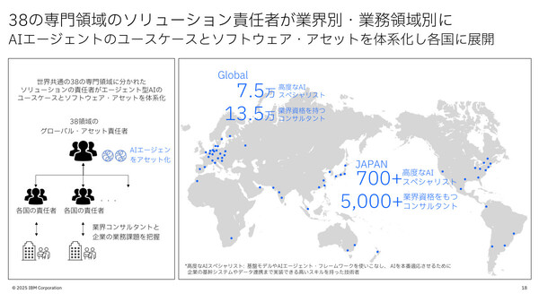 こうした業界別/業務領域別のAIエージェント(ソフトウェアアセット)は、38の専門領域のソリューション責任者が手がけるかたちで構築されており、ユースケースとアセットを体系化したうえで各国に展開されている。日本市場では、5000名超のコンサルタントと700名超のAI/SI(システムインテグレーション)エンジニアの手により展開される。