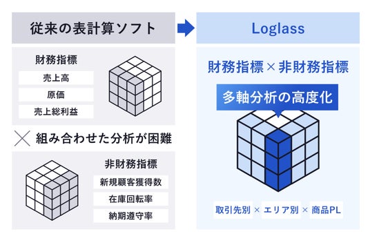 当社が提供する「Loglass 経営管理」は、企業の中に散在する経営データ(財務数値/KPIの予算・見込・実績)の収集・統合・一元管理までを効率化し、高度な分析を可能にするクラウド経営管理システムです。フォーマットが異なる表計算ファイルや各システムに散在する様々なデータを、ローデータのまま取り込んでデータベース化。見たい数値を見たいカットで簡単に可視化・分析できるようになり、経営判断の精度やスピードを高めます。