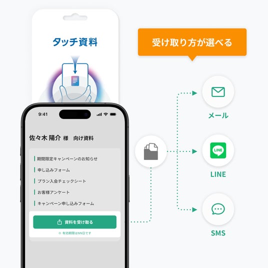 ・顧客への資料のお渡しも簡単。営業スタッフが持つ「MEET」に顧客のスマートフォンでタッチするけ。商談のその場で受け取りが完了します。・資料の送付先はメール、LINE、SMSから選択可能。顧客が受け取りたいプラットフォームで資料を受け取れるため、開封率のアップが期待できます。