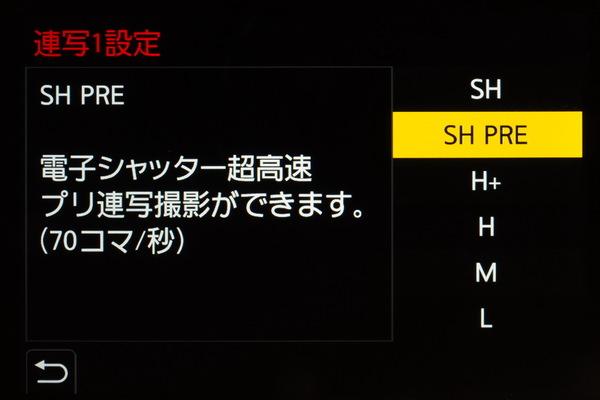 「SH」での連続撮影は180枚で一度ストップし、その後バッファが開放され次第続けて撮影が可能になる。これはRAWでもJPEGでも変わらない。また連写速度も秒70コマ(もしくは秒60コマ)に固定される。飛行機の離着陸など被写体によっては速すぎる場合もあるので、欲をいえば秒40/30/20コマなど段階的に選べるようにしてほしかった。