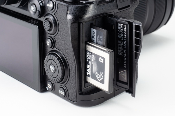 メディアはSDとCFexpress Type-Bのデュアルスロット。連写モード「SH」でRAW+JPEGで撮影し、バッファが一杯になった状態から書き込みが終了するまでの時間を計測すると、CFexpress Type-Bが約41秒、UHS-ⅡのSDが約43秒と大差は無かった。