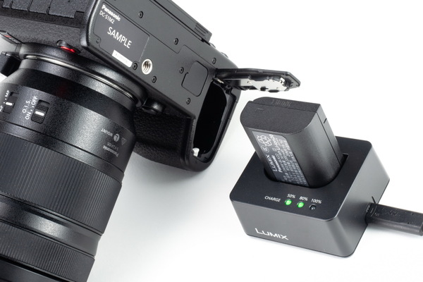 バッテリーは現行LUMIXのフルサイズ機共通の「DMW-BLK22」で充電器も付属する。公称撮影枚数は背面液晶350枚/EVF310枚。実際でもRAW+JPEGで300カット600枚撮影時に電源目盛残り一つだった。