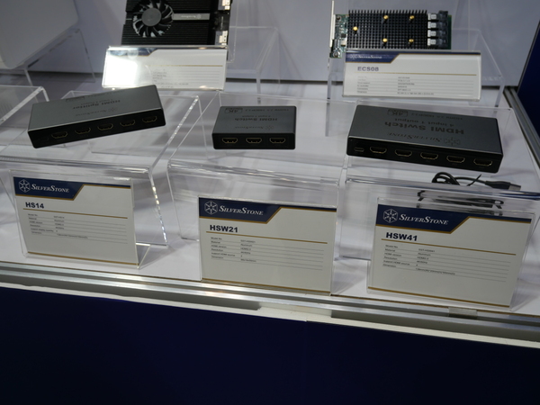 SilverStoneのブースで珍しいなと感じたのは、HDMIのキャプチャーボード。HDMI端子を3基備える「HSW21」、5基備える「HS14」、5基とUSB Type-Cを備える「HSW41」が展示されていた。いずれも4K/60Hzの映像出力に対応している。