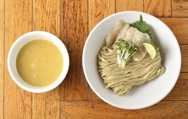まろやかな鶏白湯スープとハッカクの魚だしの旨味が溶け合ったつけ汁は、濃度が高く、とろりとした飲み口。北海道産の全粒粉を焙煎してから製麺する平打ちの自家製太麺は、風味豊かでもちもちとした弾力があり、濃厚なダブルスープと相性抜群だ。麺に添えられたハッカクの刺身にカボスを搾り、麺と一緒にすすれば、つけ麺の新境地と出合える。