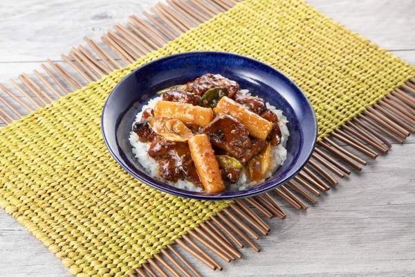 炭火で焼いた鶏肉とトッポギを特製のヤンニョムダレで味付けした、ピリ辛な味わいの韓国風焼き鳥丼です。「スップル=炭火」「グイ=焼く」という意味だそうです。覚えておきましょう!
