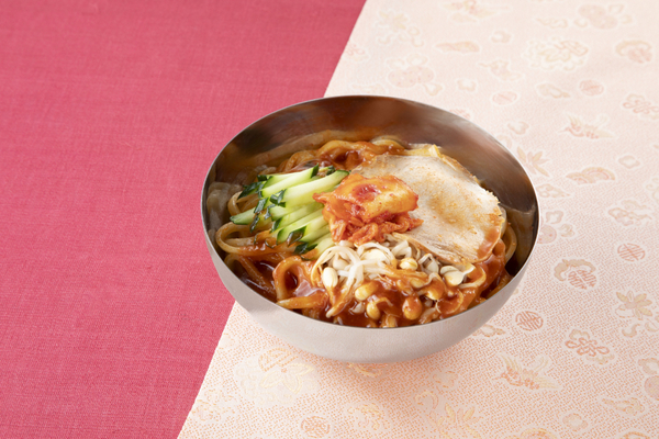 「ビビン冷麺」は、もちもちとした平麺と、具材(キムチ、チャーシュー、きゅうり、豆もやしナムル)を、コチュジャンを使用した甘辛たれで和えて食べる冷麺。隠し味にりんご酢を加えているそうです。