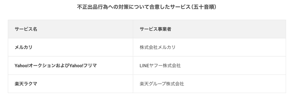 不正出品行為への対策について合意したサービスは、メルカリ(メルカリ)、Yahoo!オークションおよびYahoo!フリマ(LINEヤフー)、楽天ラクマ(楽天グループ)である。