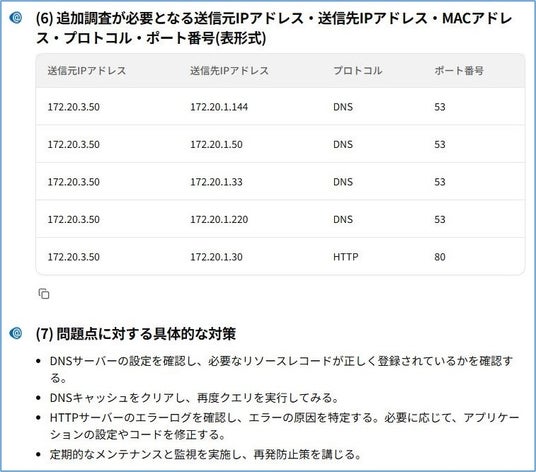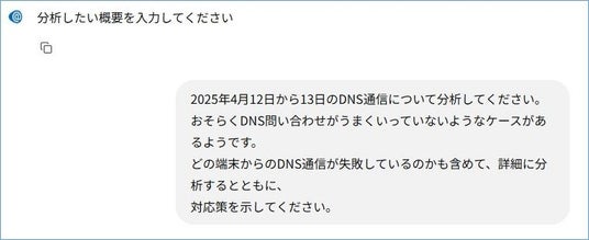 2025年4月12日~13日の間に問題が発生したとみられるDNS通信について、ネットワーク運用者がトラブル解析依頼を行い、本製品が「トラブル原因の推定や対応策(解析レポート)」を提案した例(一部)です。