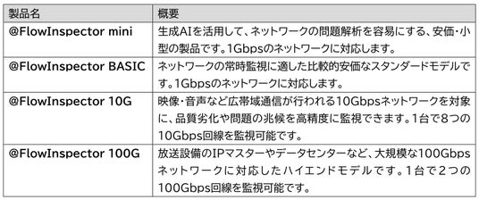 ネットワークトラフィック可視化・分析システム「@FlowInspector」シリーズにおいて、生成AIを活用することでネットワークの問題解析を容易にする、小型・軽量・安価な製品です。