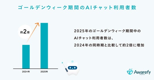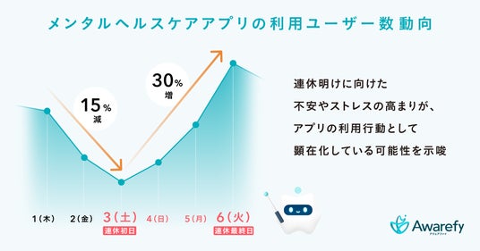株式会社Awarefy(本社:東京都新宿区、代表取締役 CEO 小川 晋一郎、以下「アウェアファイ」)は、2025年ゴールデンウィーク期間中のアプリ利用データをもとに、ユーザーのメンタルケア行動の変化を分析しました。