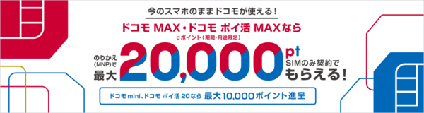 NTTドコモは6月5日0時より、ドコモオンラインショップで対象のSIMのみ契約をしたユーザー対して、最大2万dポイント(期間・用途限定)を進呈するキャンペーンを開催する。