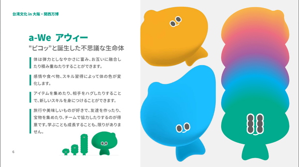 今回のキービジュアルは、台湾を象徴するオリジナルキャラクター「a-We(アウィー) 」が登場。デザインは台湾の著名デザイナー・⽅序中(ジョー・ファン)⽒が担当し、「⽂化の融合・再構築」「変化への適応⼒」「協⼒と共⽣」という台湾⽂化の本質を体現している。