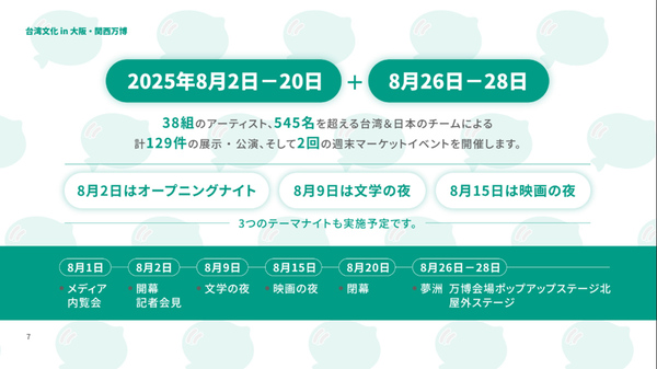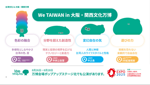 「We Taiwan 台湾文化in大阪・関西万博」は、オンラインゲーム、VR没入体験、ダンス、サウンドアート、映画、文学、フェスなどを融合した大規模文化イベントであり、大阪・関西万博に沸く大阪市内で2025年8月2日〜8月20日に開催される。