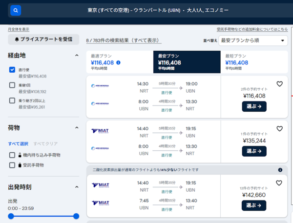 乗り継ぎ便でもお盆の時期の繁忙期は東京発で10万円代からのため、もしこの記事を読んで、モンゴルに行こうと思い立ったら、早めに航空券を手配したほうが良さそうです。