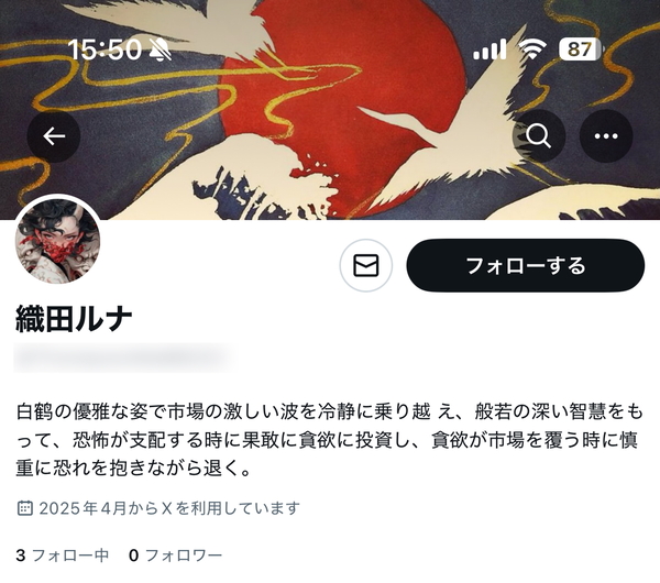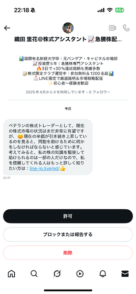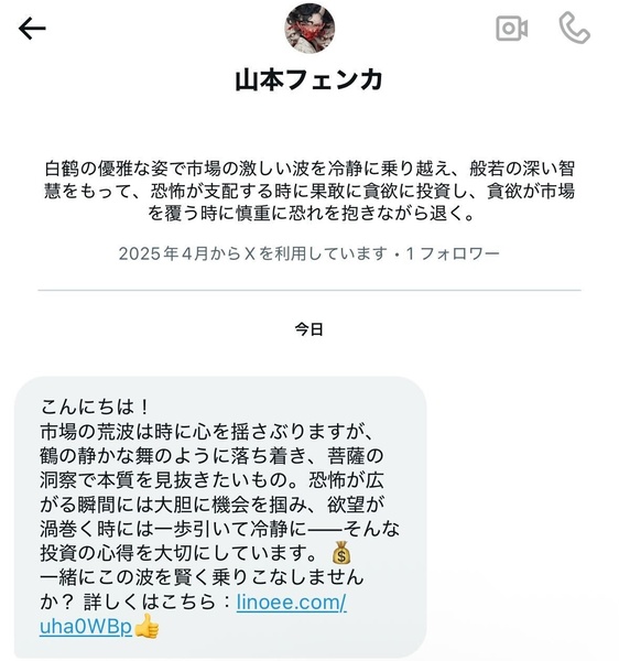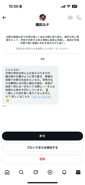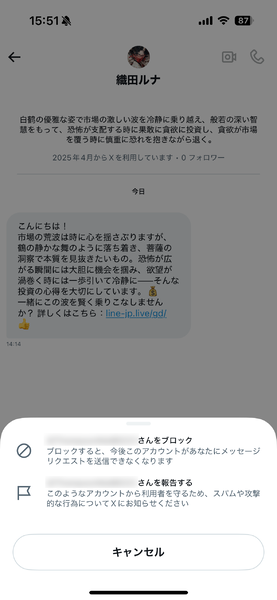 ちなみに、「織田ルナ」なるアカウントから届いたDMのリンクをタップすると、LINEの友だち登録追加画面が開きました……と書きましたが、その追加画面で出てきた「織田 里花」というアカウント名、そして同じアイコンを使用するXのアカウントからもDMが来ました。やれやれ。