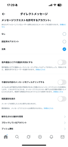 筆者のアカウントは、どんなアカウントからでもメッセージリクエストが受け取れる設定になっています。