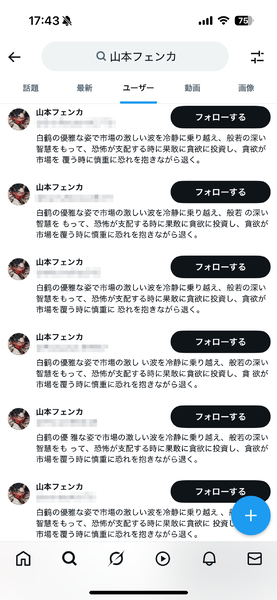 そう思って「山本フェンカ」でユーザー検索したら、アカウントが出るわ出るわ。もちろんDMを受け取った人がXに報告などしてそれらのアカウントが凍結されることもあるのでしょうが、そのたびに新しいアカウントを作って同じことを繰り返すため、いたちごっこの様相を呈しているのだと思われます。